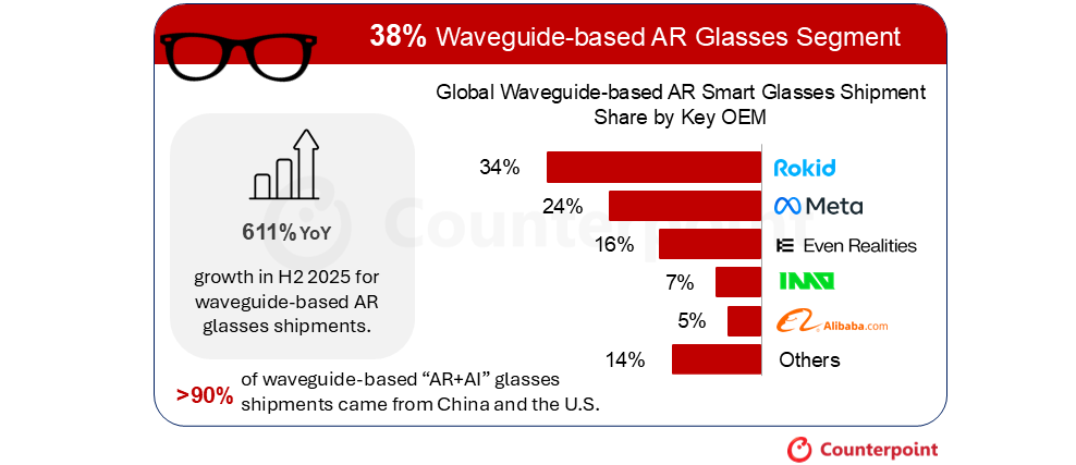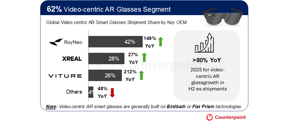 CounterPoint 報(bào)告 2025 下半年全球 AR 眼鏡出貨量增 148%:視頻型雷鳥占 42%、波導(dǎo)型樂(lè)奇 34% 領(lǐng)跑
